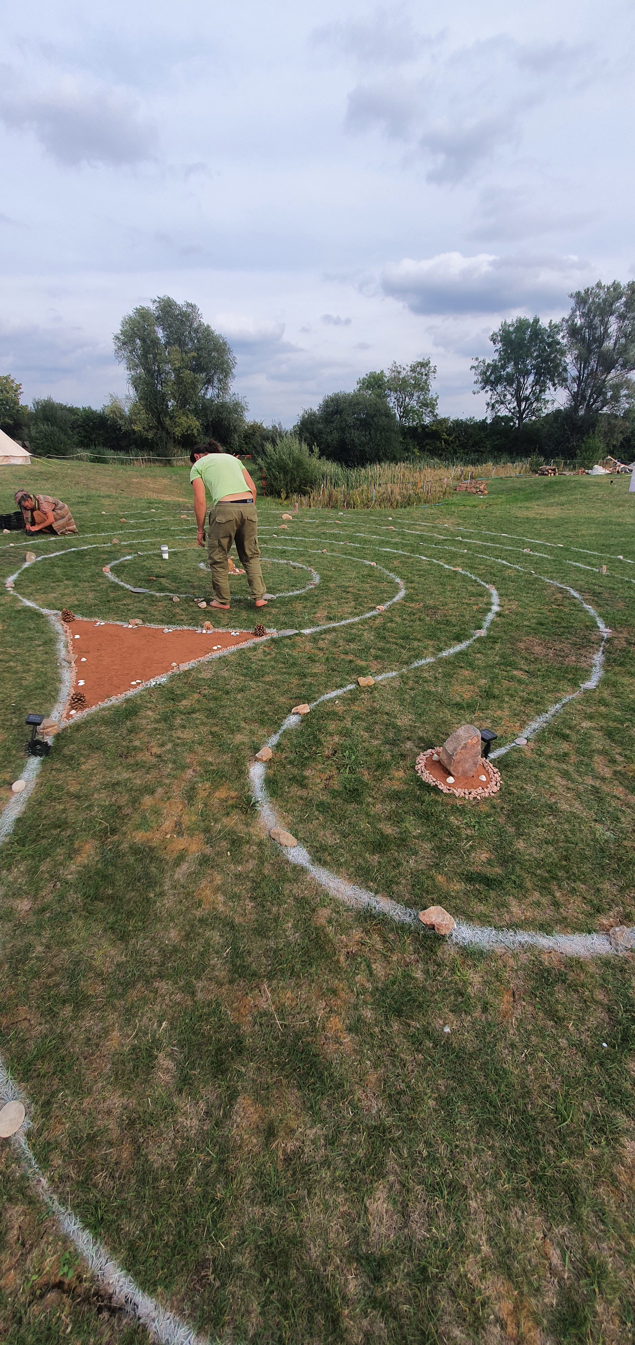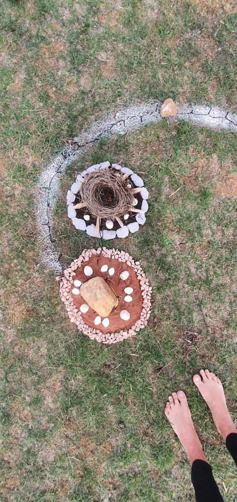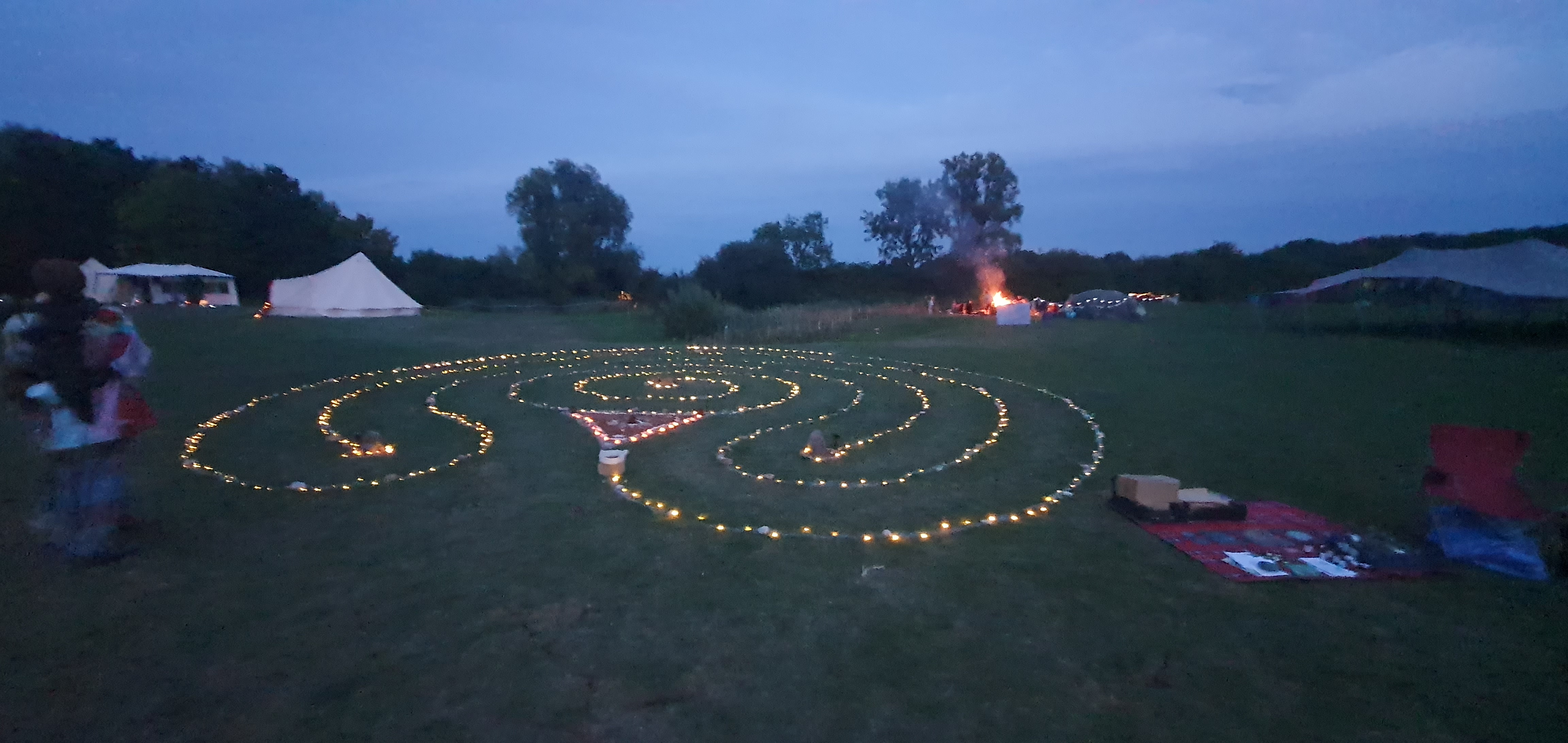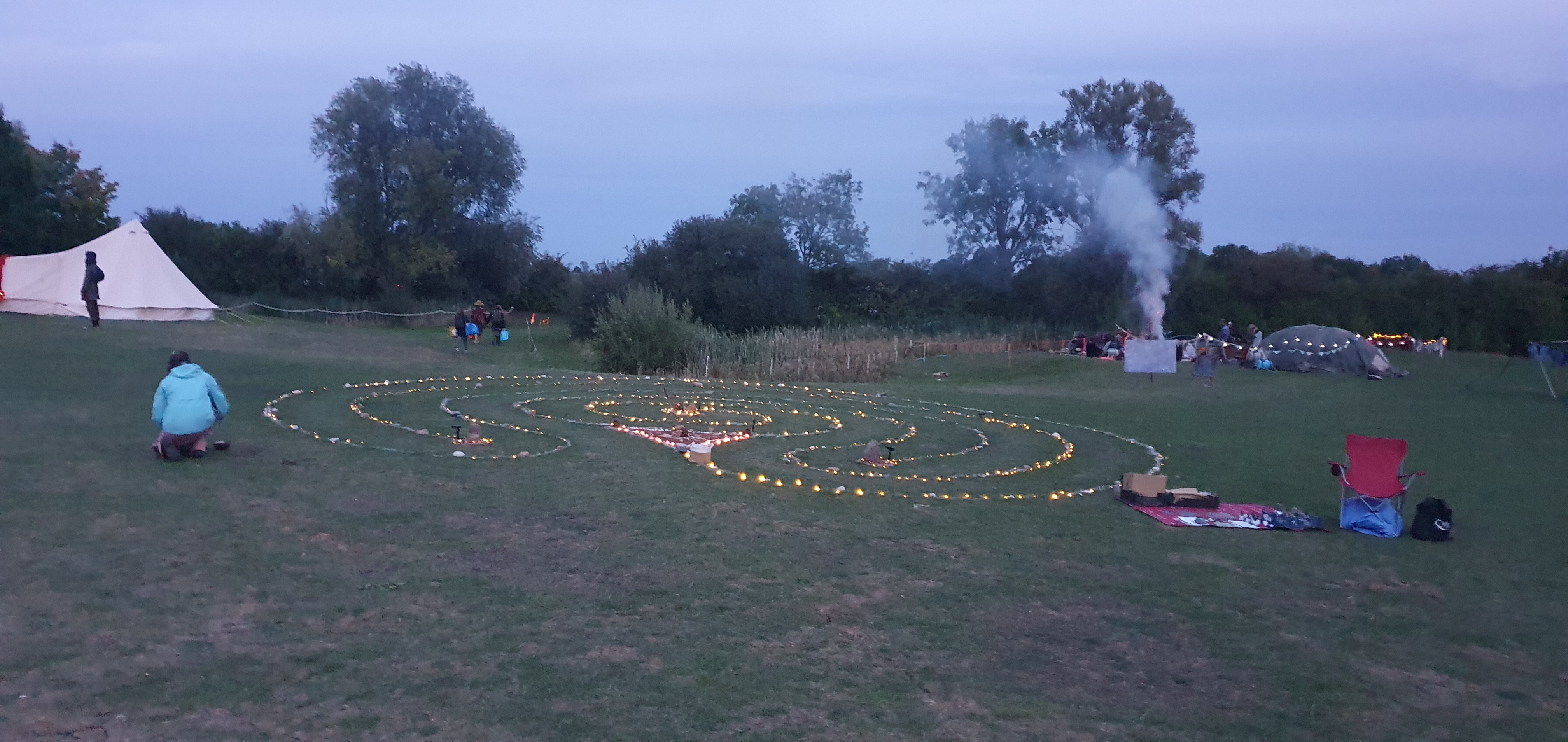 A lit up spiral labyrinth consisting of Stone, Red Earth, Shells, Berries and natural objects. A basket was filled with Rosehips at the entrance to the labyrinth. Walkers could take this offering, pray or intention in to the centre where a birds nest lay at the heart of the labyrinth.